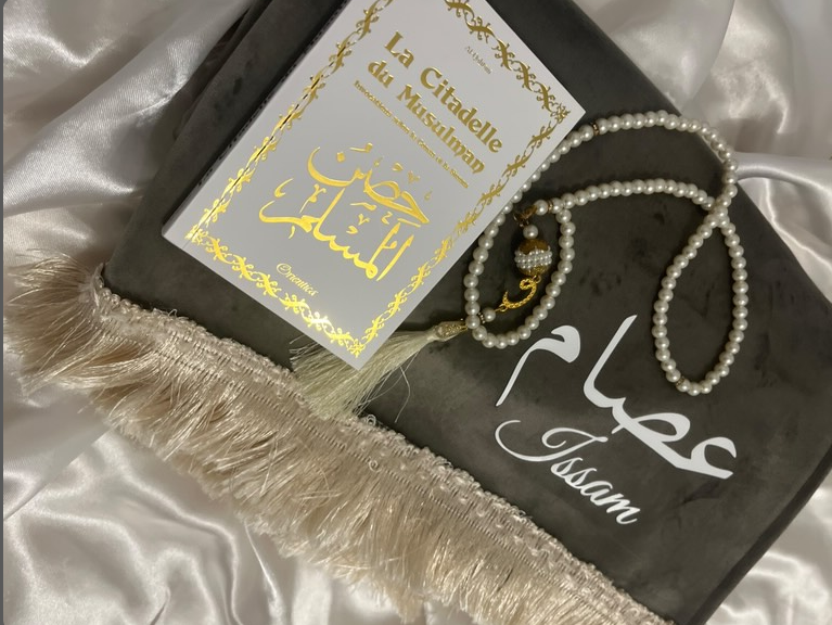 Le coffret Issam est composé d’un tapis velours de qualité premium gris, d’une citadelle du musulman et d’un tasbih blanc et doré.