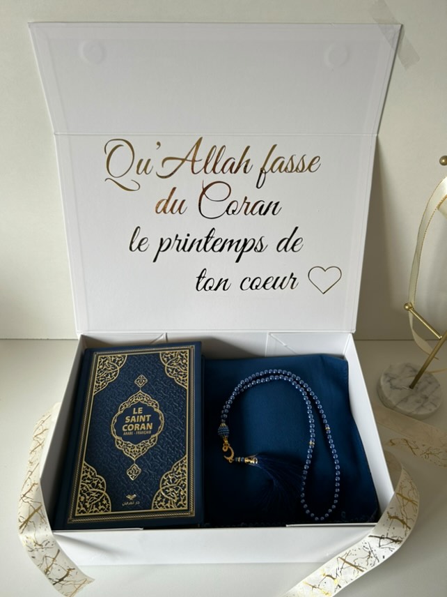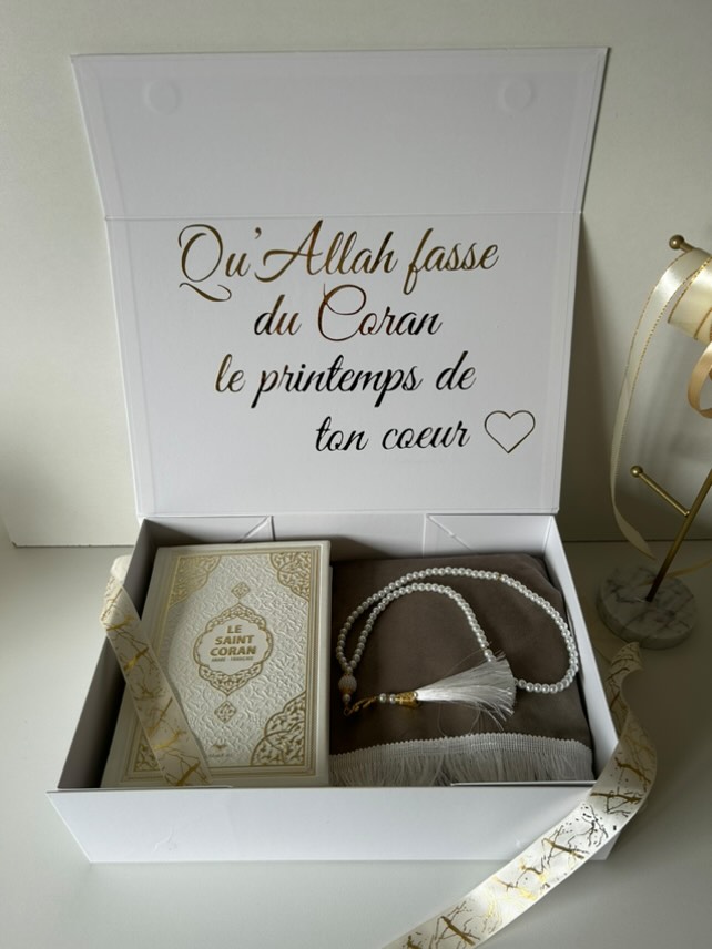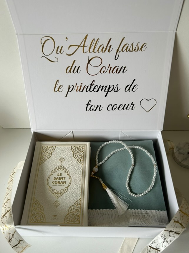 Il comprend un tapis de prière en velours premium, un Coran bilingue (arabe-français) avec des bordures dorées et un QR code sur chaque page pour accéder aux récitations en ligne, ainsi qu’un tesbih assorti.