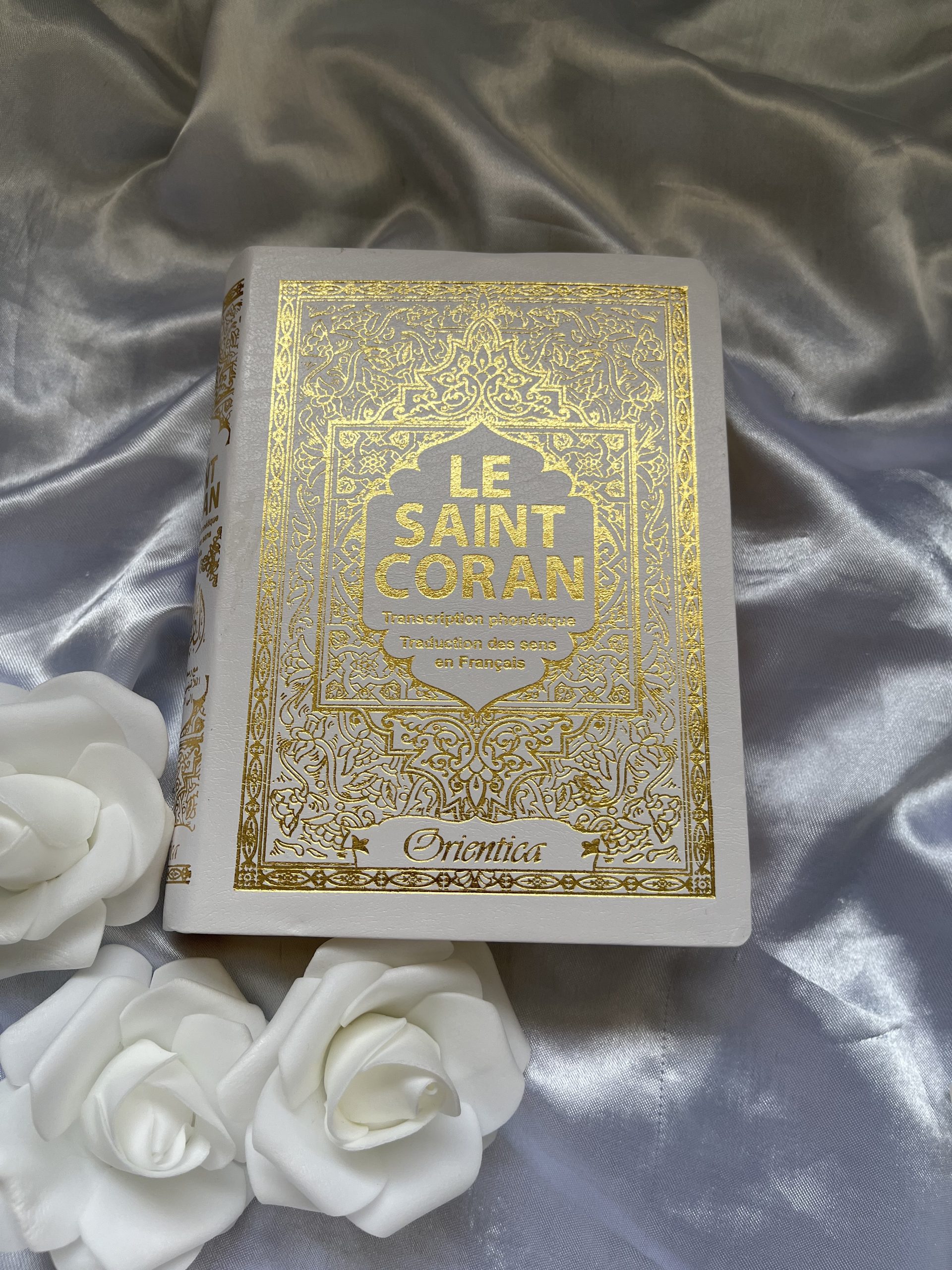 Le Saint Coran avec versets en arabe, traduction française + transcription phonétique pour le modèle blanc (translittération de l’arabe en caractères latins).