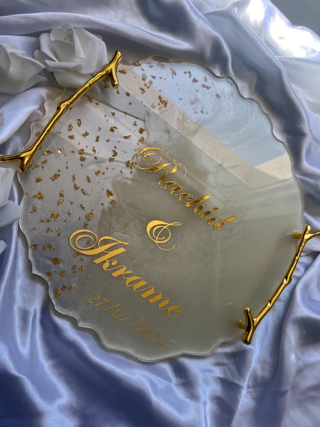 Sublimez vos évènements avec ce plateau personnalisé avec incrustation de feuille d’or et poignets dorés en résine époxy à offrir pour des futurs mariés ou pour votre mariage.